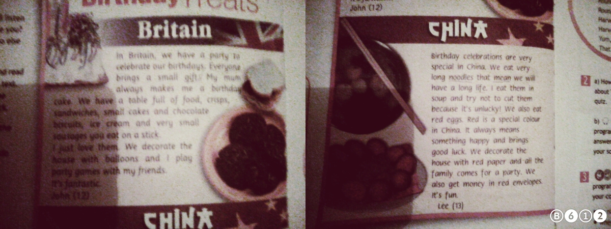 Празднование дня рождения очень своеобразно в Китае. Мы едим очень длинную лапшу, которая означает, что мы проживем очень долгую жизнь. Я ем ее в супе и пытаюсь не резать - это к несчастью! Мы так же едим красные яйца. Красный - это особенный цвет в Китае. Он всегда означает что-то веселое и приносит удачу. Мы украшаем дома красной бумагой и вся семья приезжает на празднование. Мы так же получаем деньги в красных пакетах.