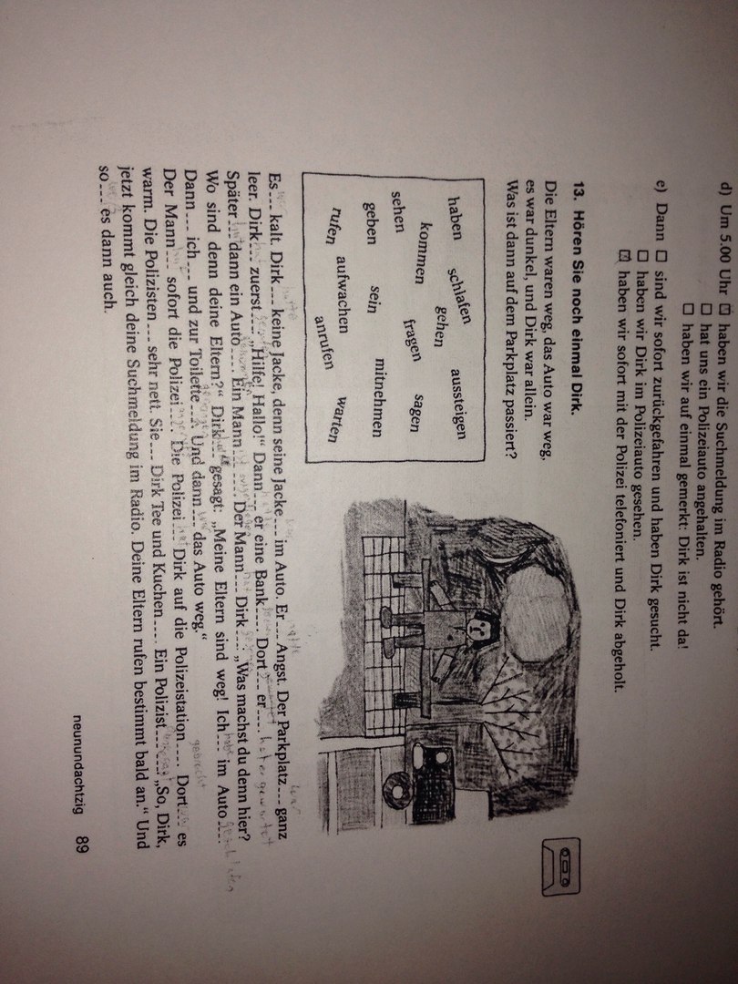 Es war kalt. Dirk hatte keine Jacke, denn seine Jacke war im Auto. Er hatte Angst. Der Parkplatz war ganz leer. Dirk hat zuerst gerufen:"Hilfe! Hallo!" Dann hat er eine Bank gesehen. Dort hat er gewartet. Später ist dann ein Auto gekommen. Ein Mann ist ausgestiegen. Der Mann hat Dirk gefragt:"Was machst du denn hier? Wo sind denn deine Eltern?" Dirk hat gesagt:"Meine Eltern sind weg! Ich habe im Auto geschlafen. Dann bin ich augewacht und zur Toilette gegangen. Und dann war das Auto weg." Der Mann hat sofort die Polizei angerufen. Die Polizei hat Dirk auf die Polizeistation mitgenommen. Dort war es warm. Die Polizisten waren sehr nett. Sie haben Dirk Tee und Kuchen angeboten. Ein Polizist hat gesagt:"So,Dirk,jetzt kommt gleich deine Suchmeldung im Radio. Deine Eltern rufen bestimmt balb an." Und so war es dann auch.