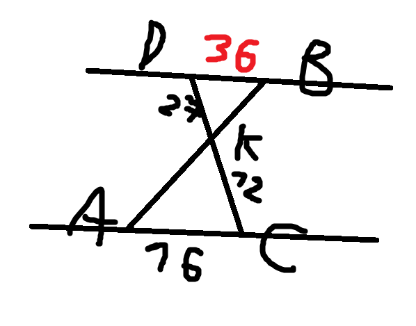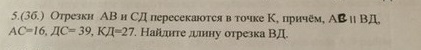 Т.к. DC=39см, DK=27см, то KC=DC-DK=39см-27см=12см. <DKB=<AKC, т.к. они вертикальны. Т.к. DB||AC, то при секущей DC, <CDB=<ACD как накрест лежащие. Т.к. <DKB=<AKC и <BDC=<DCA, то по 1-ому признаку подобия, треугольники DBK и AKC подобны, значит 12/27=16/DB=4/9. Тогда DB=16:4*9=36см.