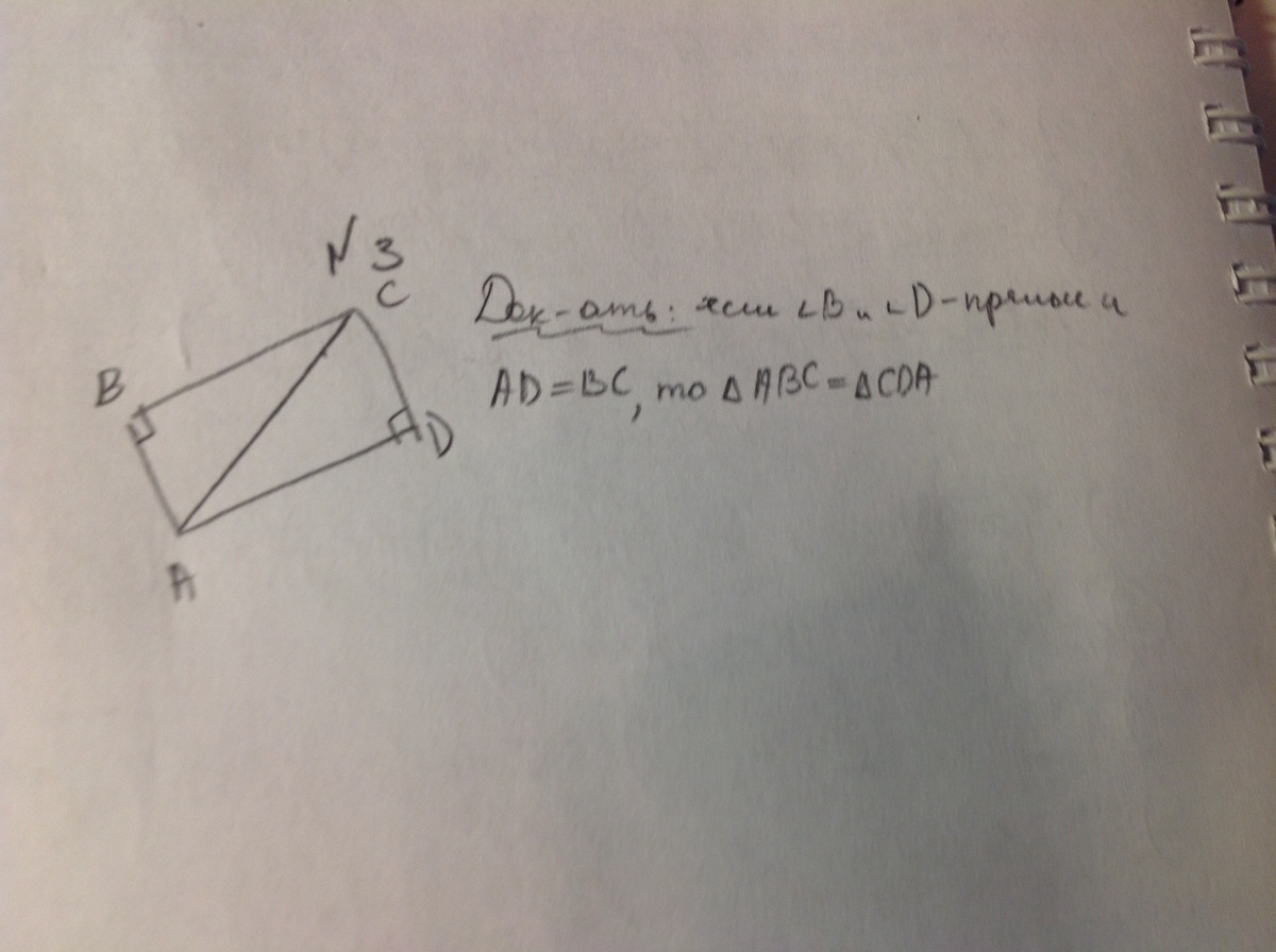 2. BC=AD, пусть BC=AD=x, тогда по теореме Пифагора: AC^2=AB^2+x^2=CD^2+x^2=>AB^2=CD^2=>AB=CD. Т.к. AB=CD, BC=AD, <ABC=<ADC=90градусов, то по 1-ому признаку равенства треугольников треугольники ABC и ACD равны.