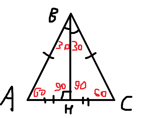 . Т.к. в равностороннем треугольнике все углы равны по 60 градусов, то <ACB=<CAB=60градусов. Т.к. BH - высота, то <BHC=<BHA=90 градусов, а значит <ABH=<HBC=180-90-60=30 градусов каждый, это также можно объяснить тем, что в равностороннем треугольнике любая высота, также является биссектрисой и медианой.
