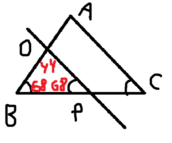 3. Т.к. OP||AC, то <BPO=<PCA=68 как соответственные при секущей PC, а значит <OPB=<OBP=68 градусов (Т.к. BAC - равнобедренный с основанием BC). Т.к. сумма градусных мер всех углов любого треугольника равна 180, то <BOP=180-68-68=44 градуса.