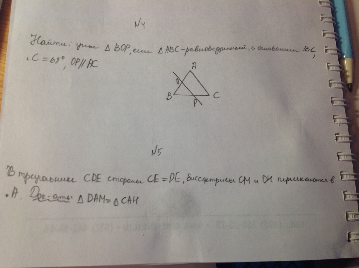 ЗАДАНИЕ3:НАЙТИ УГЛЫ ТРЕУГОЛЬНИКА ВОР,ЕСЛИ АВС-РАВНОБЕДРЕННЫЙ ТРЕУГОЛЬНИК,С ОСНОВАНИЕМ ВС,УГОЛ С=68 ГРАДУСОВ,ОР ПАРАЛЛЕЛЬНО АС.
