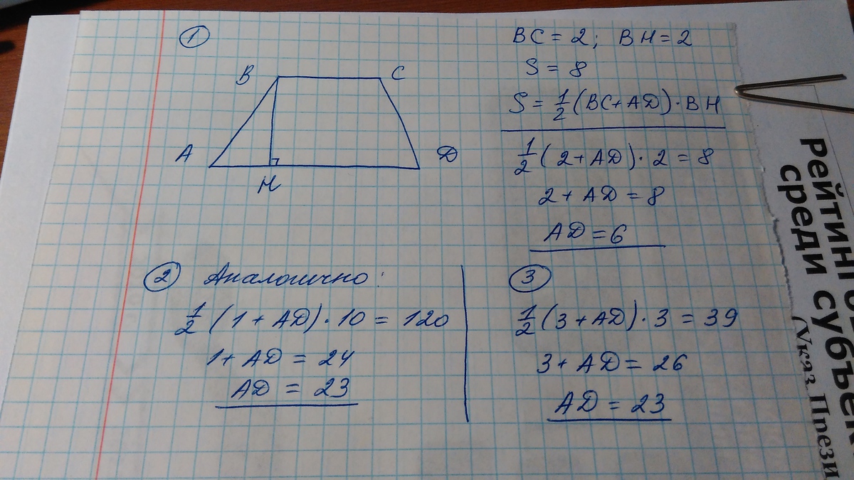 3.Основание трапеции равно 3, высота равна 3, а площадь равна 39. Найдите второе основание трапеции.