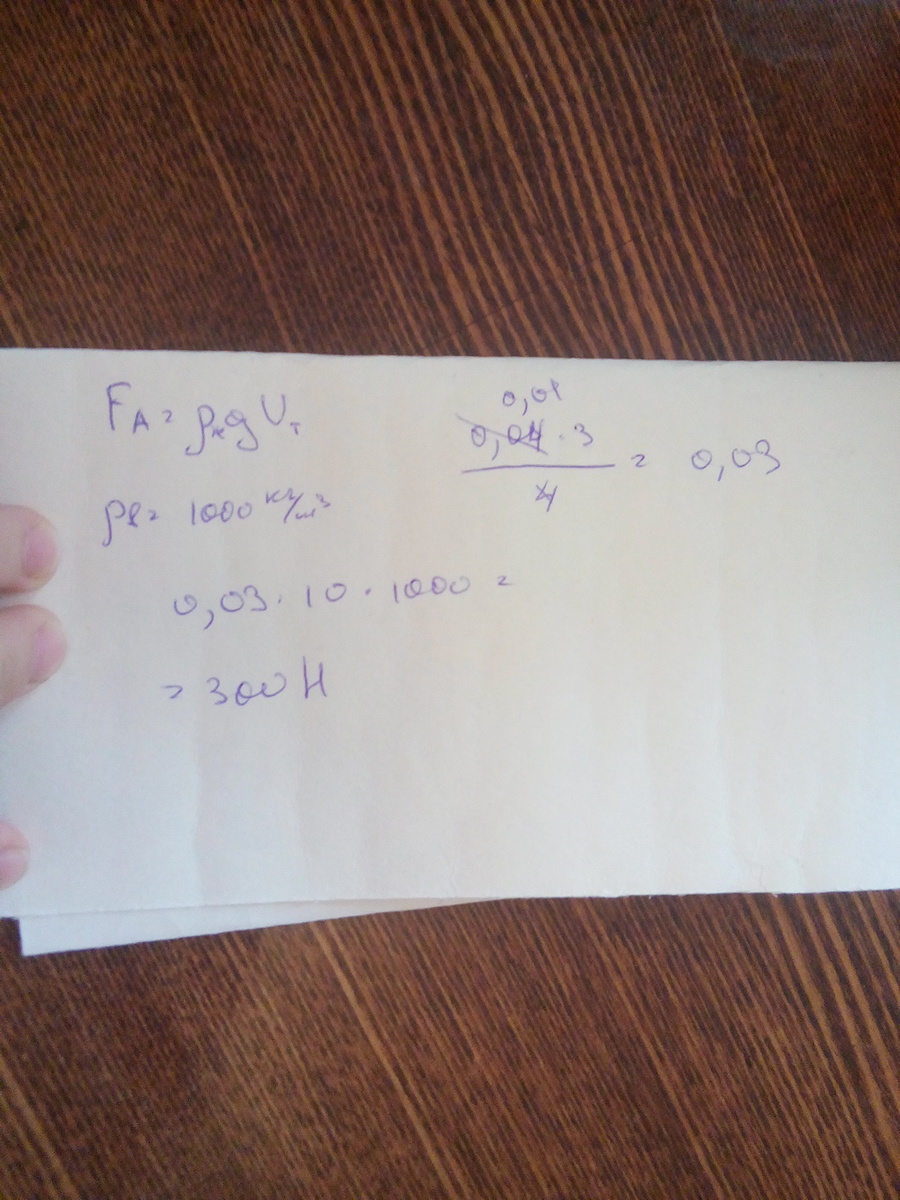 определите силу Архимеда действующую на шар объемом 0,04м^3, если он погружен в воду на 3/4 своего объема Помогите пожалуйста