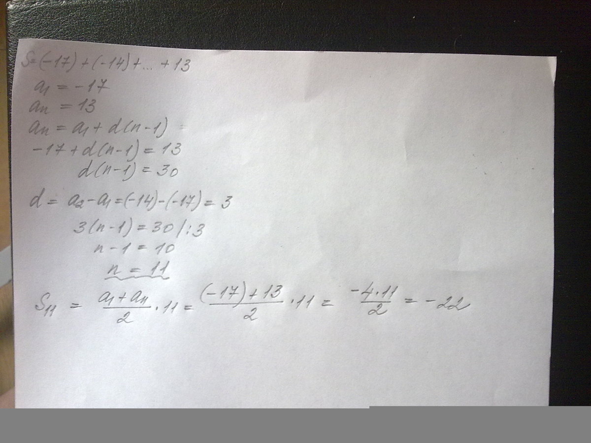 Найдите сумму, если её слагаемые-последовательные члены арифметической прогрессии: -17+ (-14) + (-11)+...+13
