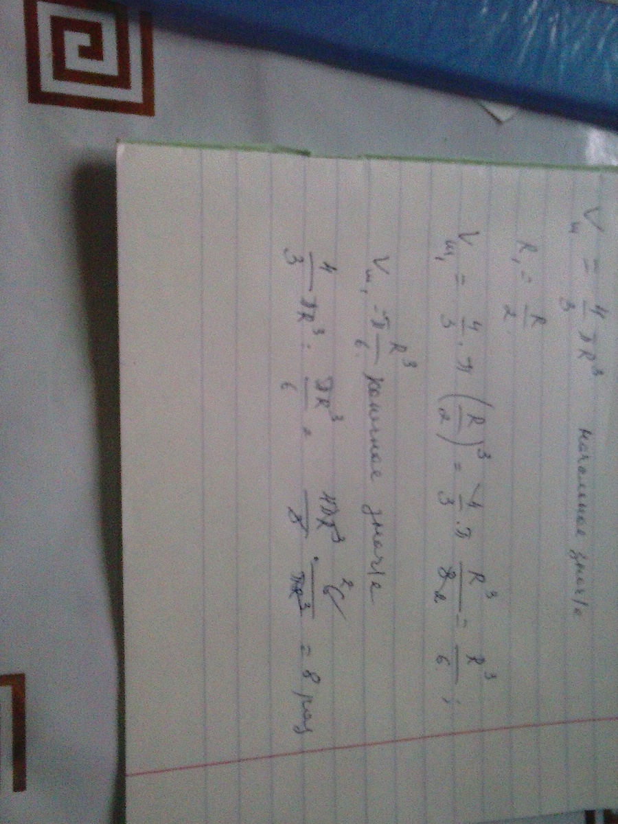 V1=4/3пR^3. V2=4/3п(R/2)^3=пR^3/6V1:V2=4/3пR^3 :пR^3/6= 8.