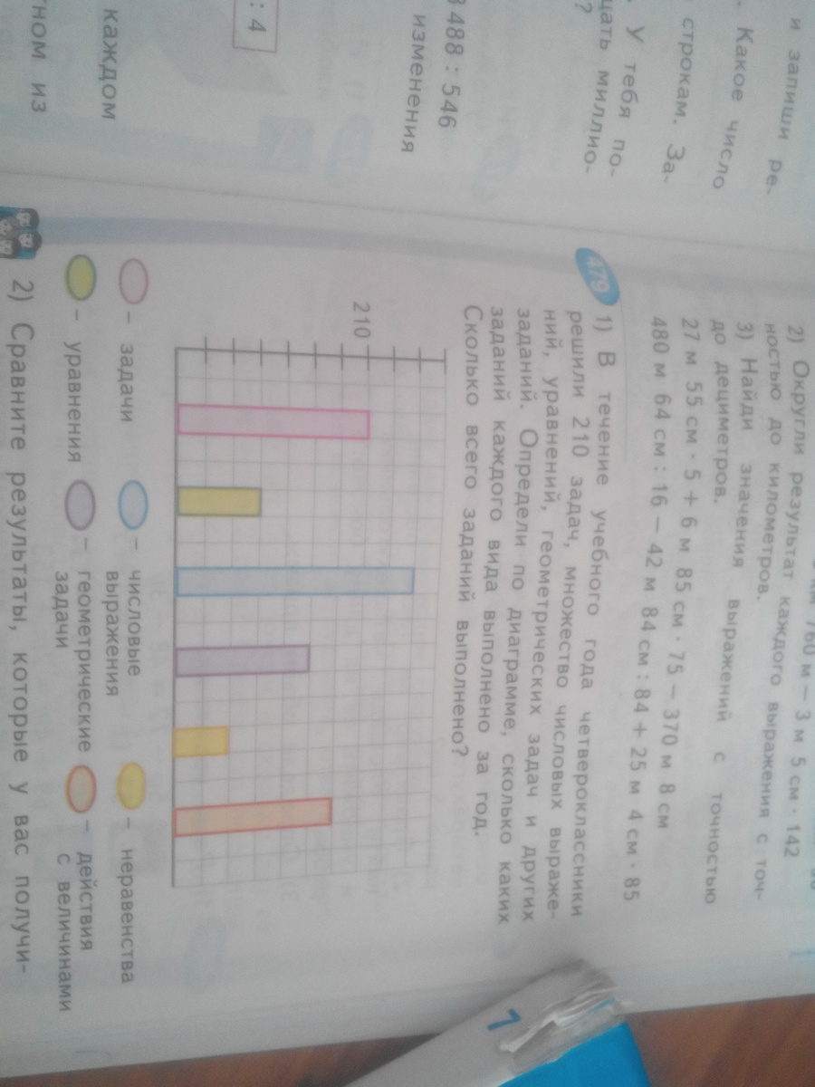1) В течение учебного года четверокласники решили 210 задач, множество числовых выражений, уравнений, геометрических задач и других заданий за год.