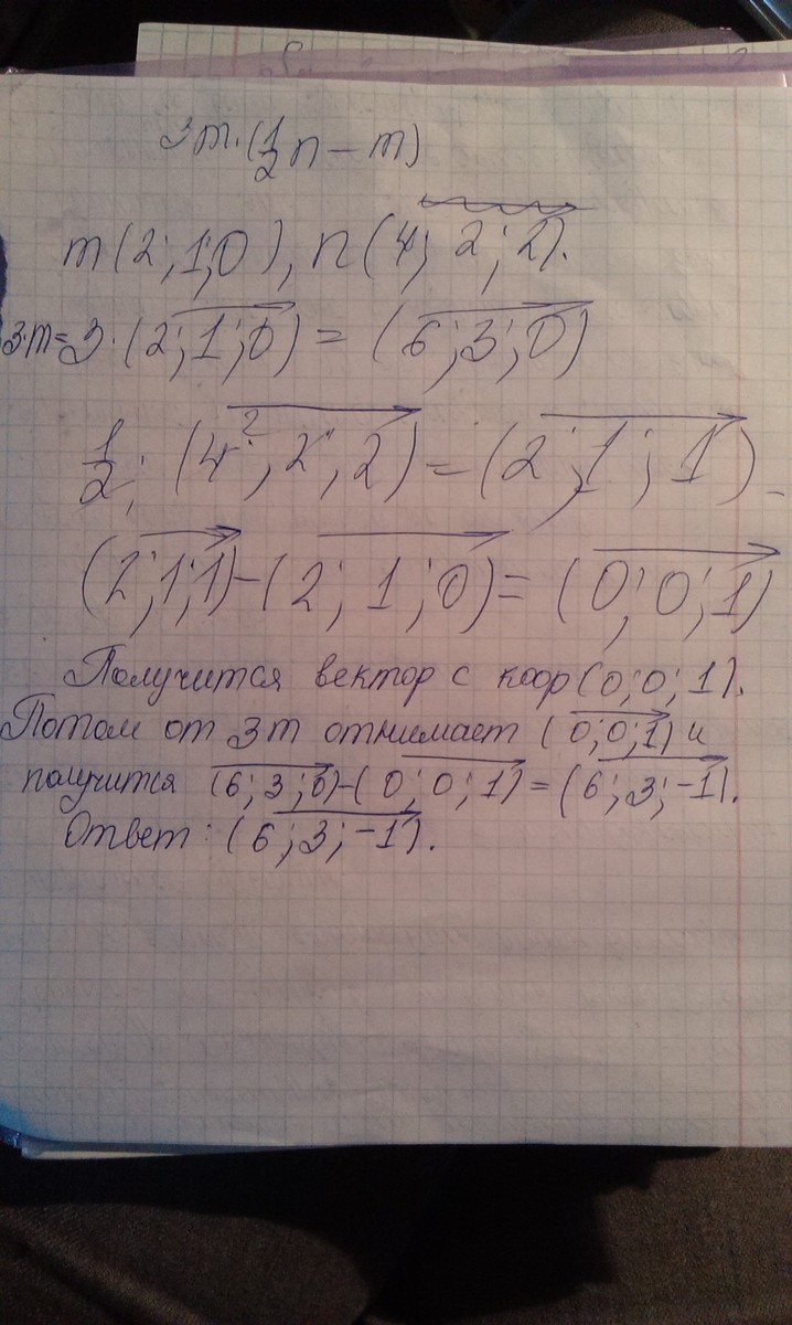 Вычислить векторное произведение 3m x(1/2n-m), если даны координаты векторов m=(2; 1; 0), n=(4; 2; 2).