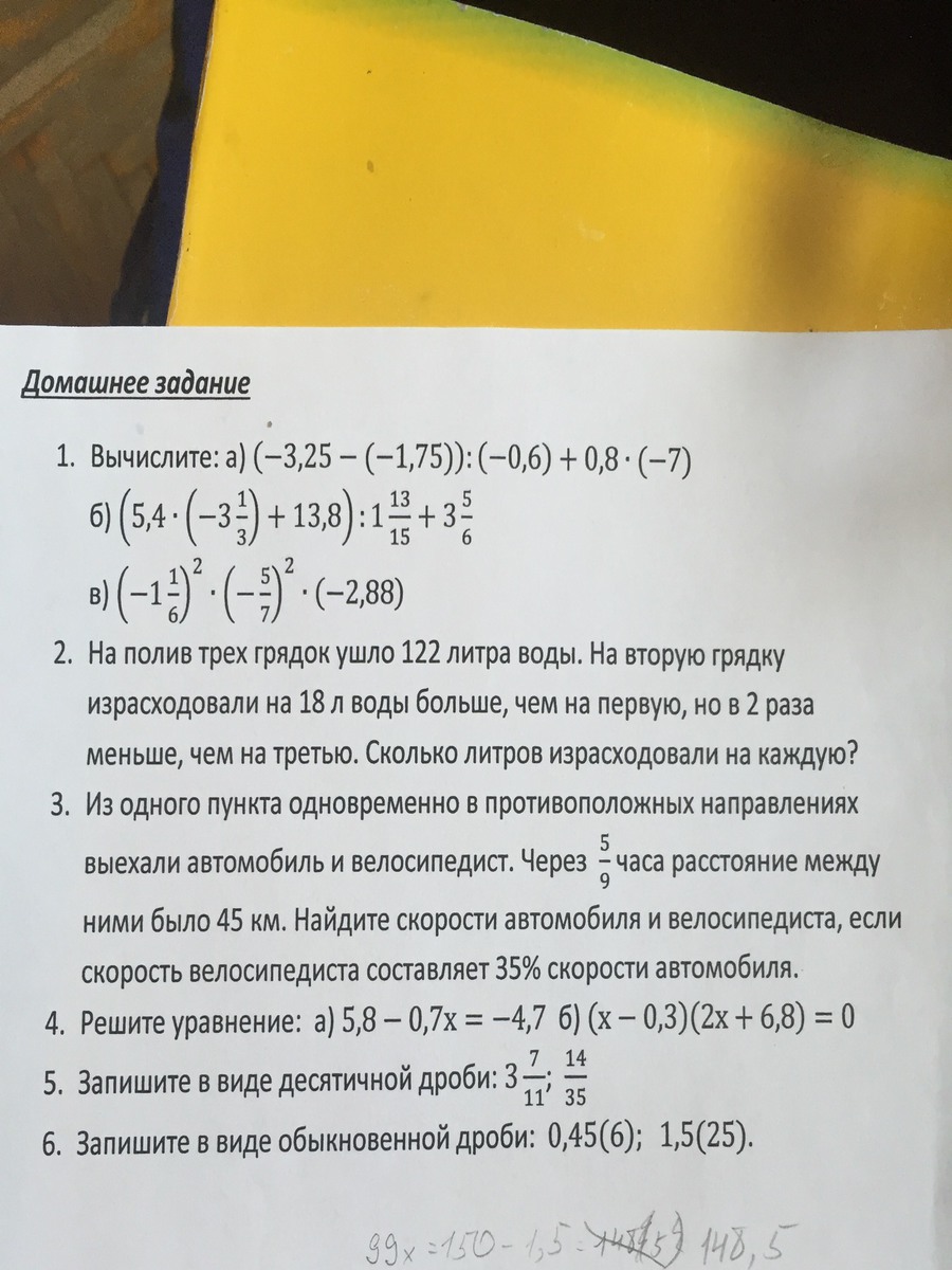 Пусть х км/ч скорость автомобиля 0,35х км/ч скорость велосипедиста . Расстояние автомобиля 5/9х км, а велосипедиста 5/9*0,35 х км. По условию расстояние между ними 45 км . Составляем уравнение 5х+1,75х=45*9