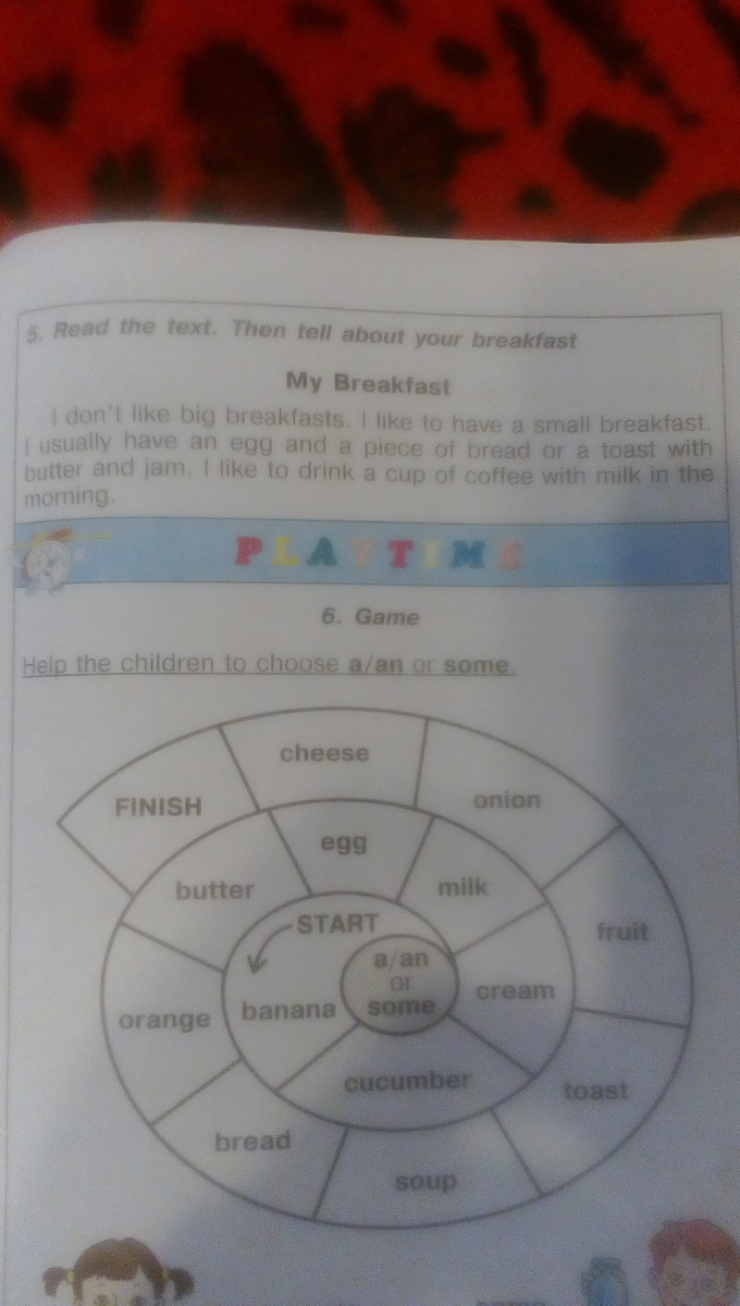 я не люблю большие/плотные завтраки. мне нравится, когда у меня есть маленькие/легкие завтраки. Обычно у меня есть яйцо и кусок хлеба иди же тост с маслом или джемом. Я люблю выпивать чашку кофе с молоком по утрам.