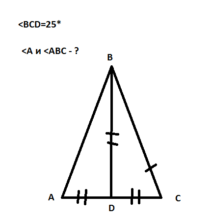 Равнобедренный треугольник ABC=> боковые стороны равны. Медиана BD делит основание треугольника ABC на 2 равные части. Угол BDC= 90°. Угол АВС=30°. Угол А=60°
