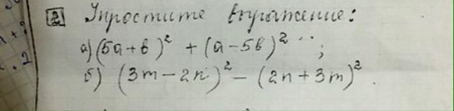 1) (5а+b)^2+(a-5b)^2 = (25a^2+10ab+b^2)+(a^2-10ab+25b^2) =