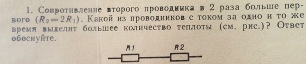 Сопротивление второго проводника в 2 раза больше первого R2 = 2R1. Какой из проводников с током за одно и то же время выделит большее количество теплоты? Проводники соединены последовательно. Ответ обоснуйте.