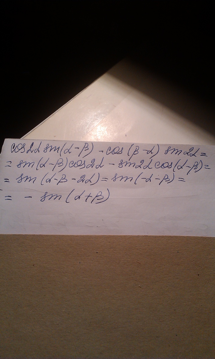 cos 2α*sin(α-β) - cos(β-α)*sin2α = sin(-(β -α))*cos2α* - cos (β-α)* sin2α=-(sin(β -α)*cos2α +- cos (β-α)*sin2α) = -sin(β-α+2α)= -sin(α+β).