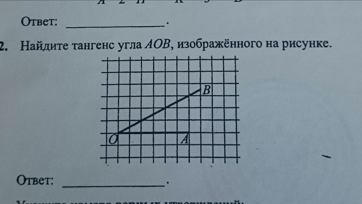 Опустим перпендикуляр из точки B на прямую AO для получения прямоугольного треугольника. Тангенс угла в прямоугольном треугольнике — отношение противолежащего катета к прилежащему: tg AOB=6/6 = 1 , так же можно проверить по транспортиру, угол будет 45 градусов, а tg45=1