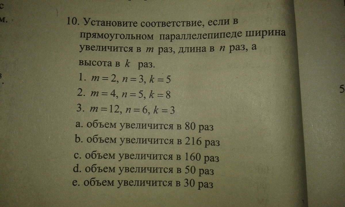 V=abc - обем паралелепипеда. Например 1)V=2a*3b*5c=30abc, то есть обьем увеличится в 30 раз (30abc в 30 раз больше abc).
