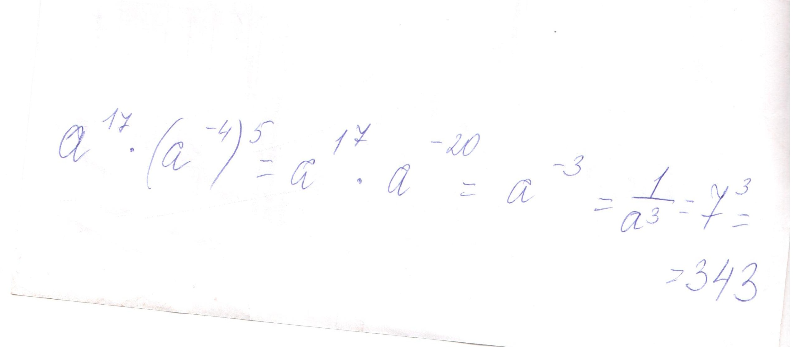 а¹⁷ * ( а ⁻⁴ ) ⁵=а¹⁷*а ⁻²⁰=а⁻³= 1 = 7³=343