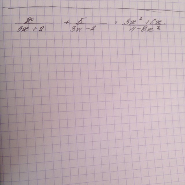 х(2-3х)-5(2+3х)=3х^2+6x, 2x-3x^2-10-15x=3x^2+6x, 6x^2+19x+10=0, Д=361-4*6*10=121, х(1)=(-19+11)/12=-8/12=-2/3; побочный корень, обращает знаменатель (3х+2) в ноль; х(2)=(-19-11)/12=-30/12=-5/2=-2,5.