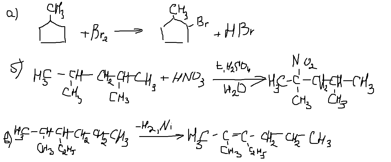 Напишить схеми реакций а)бромування метилциклопентану б)нитрування 2,4-диметилпентану в)дегидрування 2-метил-3-етилгексану