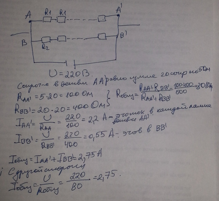 Две параллельные ветви включены в напряжение 220 В. В первой ветке включены последовательно 20 ламп по 5 ОМ каждая, а во второй включены последовательно 20 ламп по 20 Ом каждая. Найти общее сопротивление ветвей, ток в каждой лампе и общий ток до разветвления.