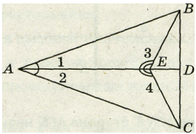 1. Угол BЕD = 180° – угол 3; угол СЕD = 180° – угол 4 = 180° – угол 3 ⇒ угол ВЕD = углу СЕD 2. Рассмотрим треугольники АВЕ и АСЕ: угол 1 = углу 2, угол 3 = углу 4, сторона АЕ — общая ⇒ треугольник АВЕ равен треугольнику АСЕ (по второму признаку) ⇒ ВЕ = СЕ 3. Рассмотрим треугольники ВЕD и СЕD: BE = CE (из пункта 2), угол BED = углу CED (из пункта 1), сторона ED — общая ⇒ треугольник BED равен треугольнику CED (по первому признаку) ⇒ угол EBD = углу ECD (ч. т. д.)