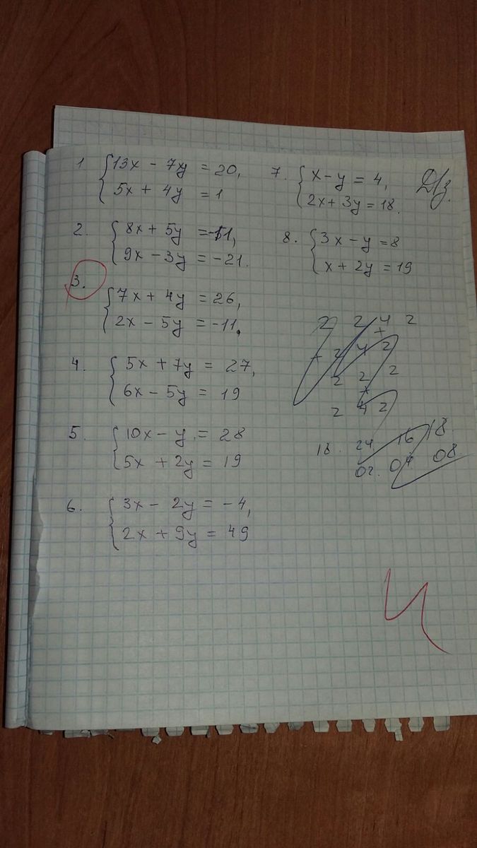 из второго уравнения выразим х 2х-5у=-11 х=(-11+5у):2 вставим в первое