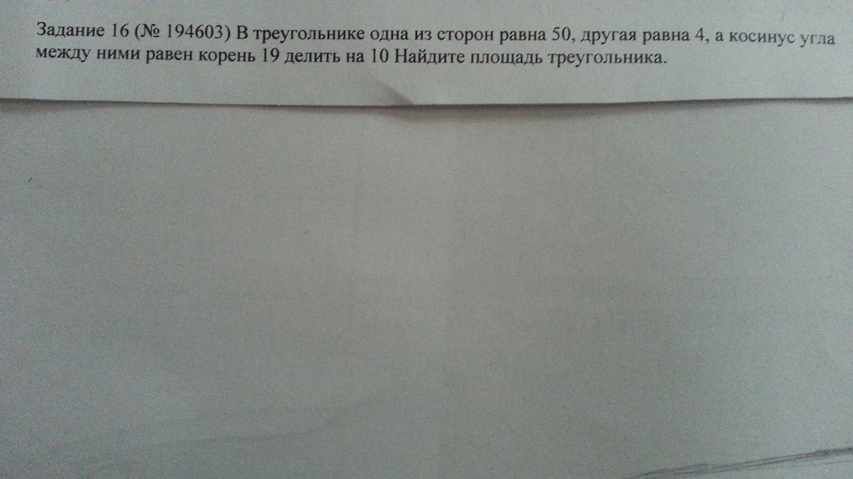sin^2 = 1-cos^2 = 1-19/100 = 81/100 sin = 9/10 Площадь треугольника 50*4*9/10 = 180