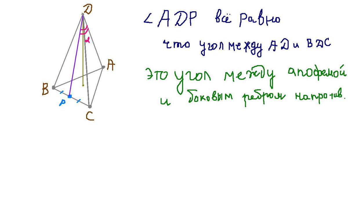 Точка Р - середина ребра ВС тетраэдра DABC. Докажите, что угол ADP равен углу между прямой AD и плоскостью BDC.
