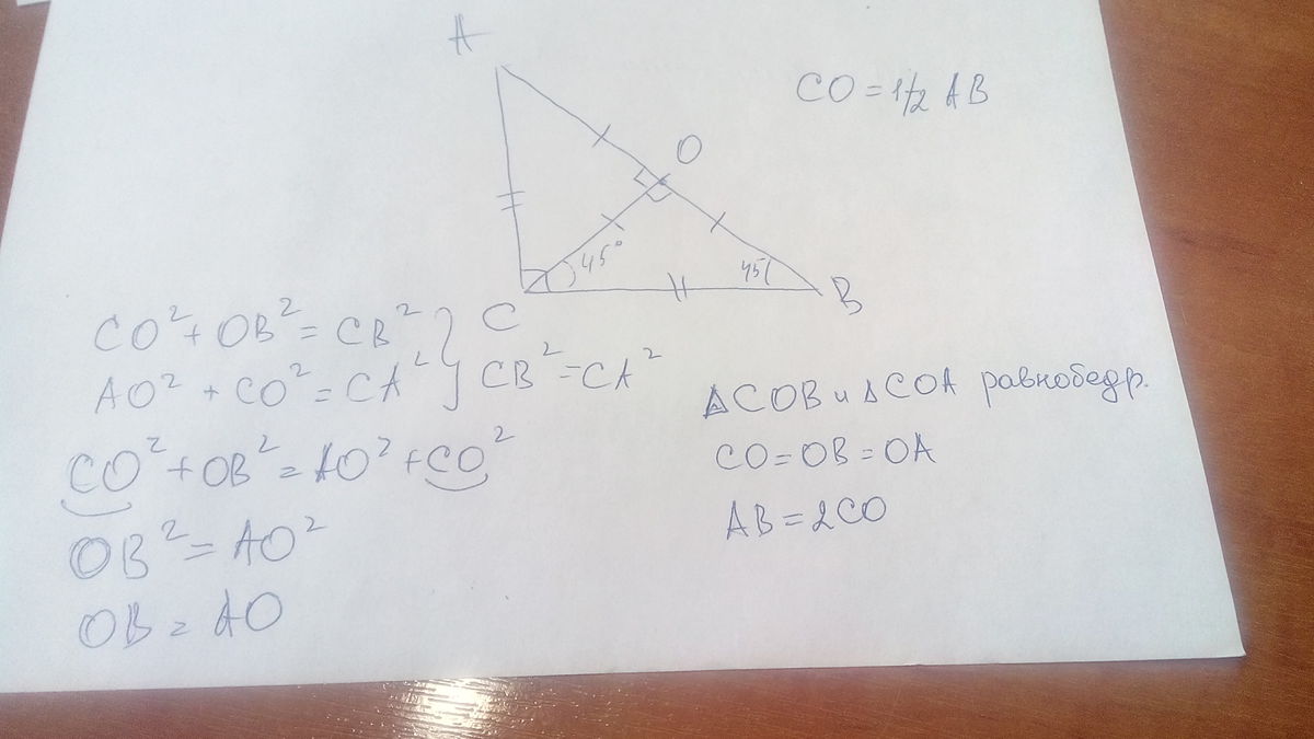 Дан равнобедренный прямоугольный треугольник АВС. Докажите, что расстояние от вершины прямого угла С до прямой АВ равно половине гипотенузы.