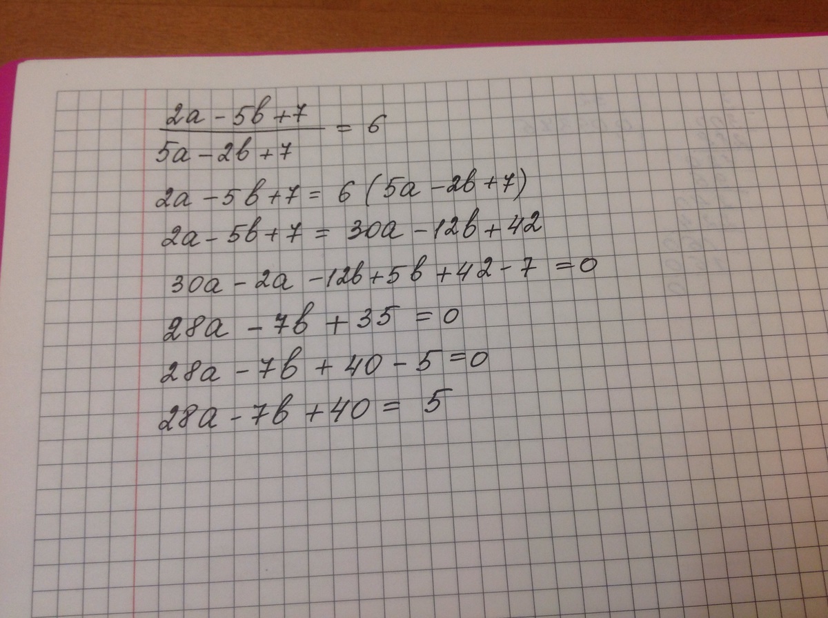 Найдите значение выражения 28a-7b+40 если (2a-5b+7)/(5a-2b+7) все это выражение равно 6