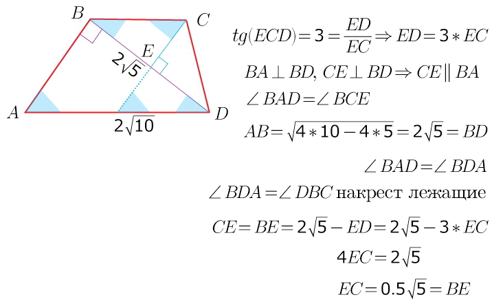 В трапеции ABCD ( BC параллельно AD ) AB перпендикулярно BD, BD= 2 корня из 5, AD= 2 корня из 10, CE- высота треугольника BCD, а tg угла ECD= 3. Найдите