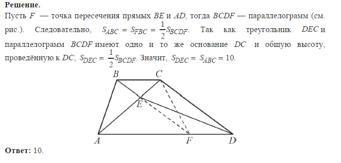 В трапеции ABCD(AD//BC,AD>BC) на диагонали AC выбрана точка Е так, что BE//CD. Площадь треугольника ABC равна 10. Найдите площадь треугольника DEC.Помогите очень вас прошу!!!
