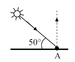 Высота Солнца над горизонтом (см. рисунок) равна 50°. Каков угол падения луча на плоское зеркало, расположенное под некоторым углом к горизонту в точке А, если луч отразился от зеркала вертикально вверх? 1) 40° 2) 90° 3) 20° 4) 50°