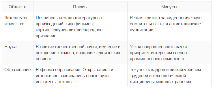 ОбластьПлюсыМинусыЛитература, искусствоПоявилось немало литературных произведений, кинофильмов, картин, получивших всенародное признание.Резкая критика за «идеологическую сомнительность» и антисталинские публикации.НаукаРазвитие отечественной науки, изучение и покорение космоса, создание технических новинок.Узкая направленность науки — приоритет интересам военно-промышленного комплекса.ОбразованиеРеформа образования. Открывались и интенсивно развивались новые вузы, институты, школы.Текучесть кадров и низкий уровнем трудовой и технологической дисциплины молодых рабочих.