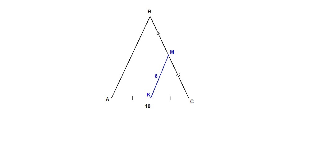найдите периметр равнобедренного треугольника если его основание равно 10, а средняя линия, параллельная боковой стороне. равна 6