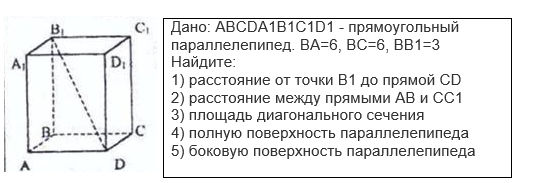 1) от точки В1 до СС1 это В1С . Ищем этот отрезок по т. Пифагора из ΔВВ1С. В1С² = 6² + 3² = 36+9 = 45, В1С = √45 = 3√5