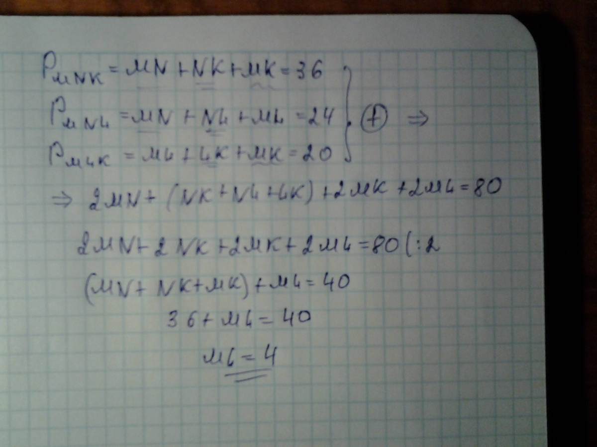 Периметр треугольника MNK равен 36 дм. Медиана ML делит его на два треугольника с периметрами 24 дм и 20 дм. Найдите отрезок ML.