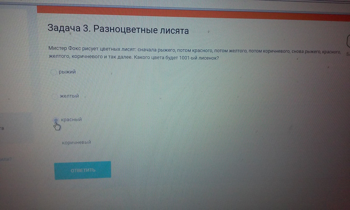 1001:4=250,25; 1001-250*4=1 значит будет рыжий