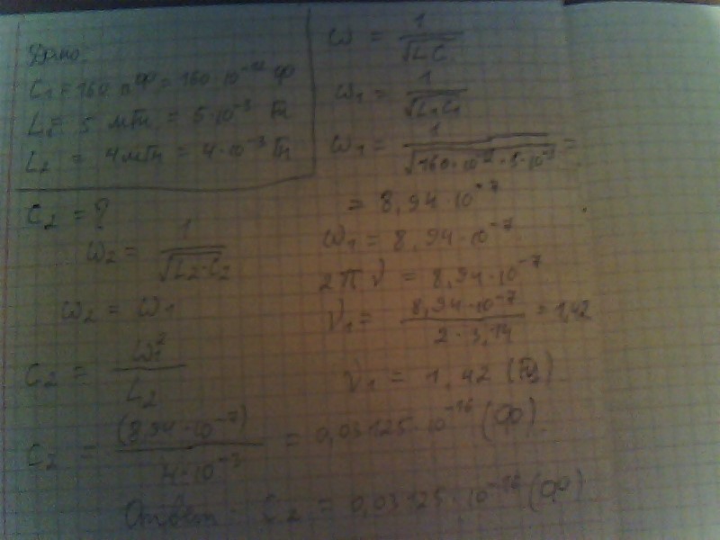 передающий колебательный контур имеет параметры емкость 160 пкФ индуктивность 5 мГн. В приемном контуре ндуктивность 4 мГн. Какой должна быть емкость что бы наблюдать резонанс