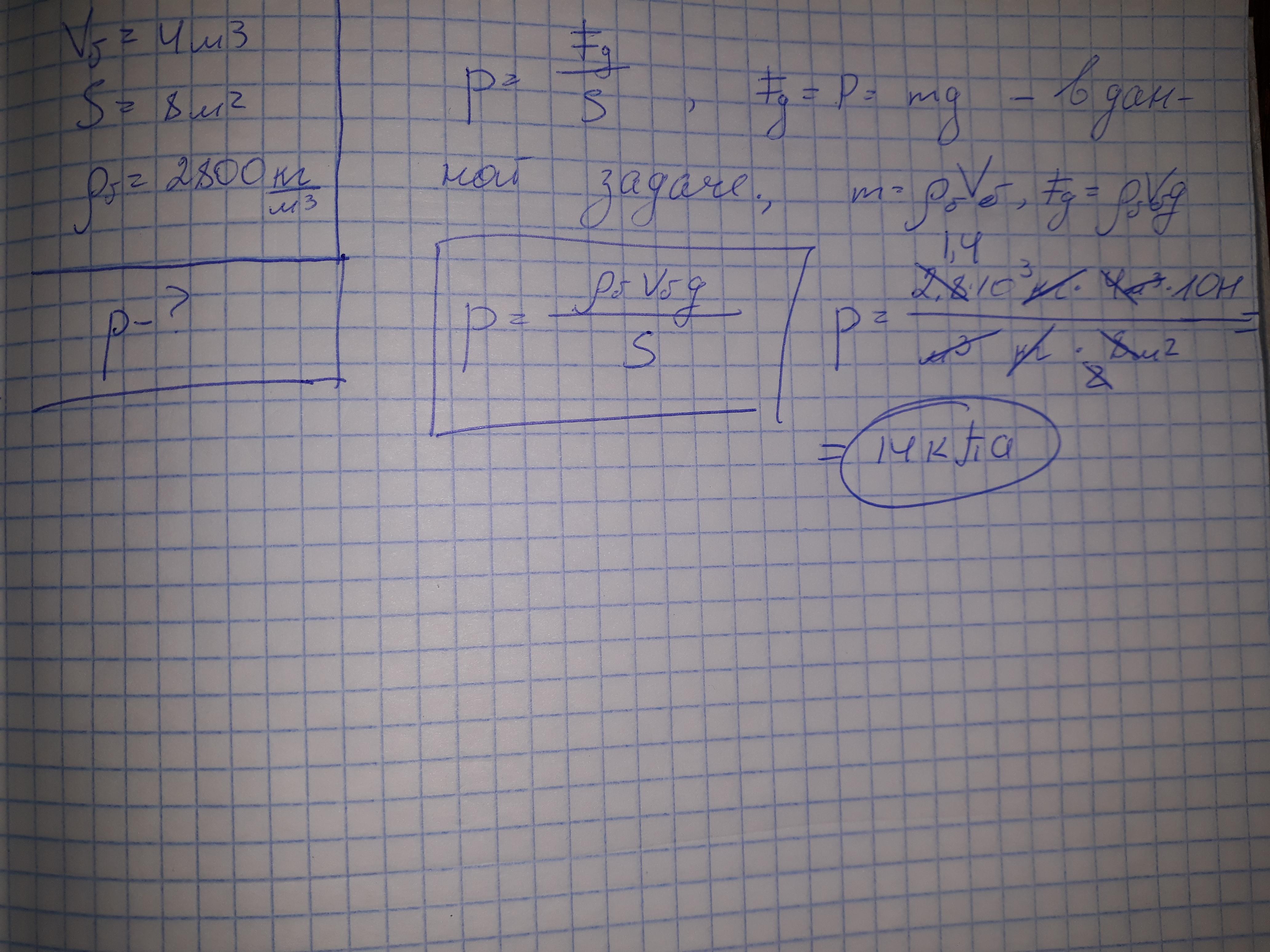 Какое давление оказывает на грунт бетонная плита объёмом 4 м(3), если её основание 8 м(2).Плотность бетона 2800 кг/м(3)