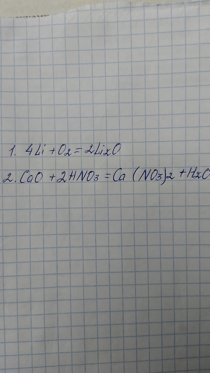 1)4Li + O₂ = 2Li₂O 2)CaO + 2HNO₃ = Ca(NO₃)₂ + H₂O