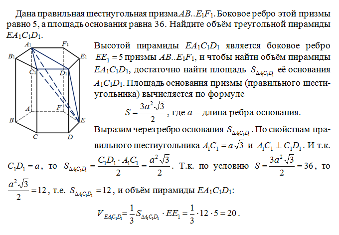 Дана правильная шестиугольная призма AB..E1F1. Боковое ребро этой призмы равно 5, а площадь основания равна 36. Найдите объём треугольной пирамиды EA1C1D1.