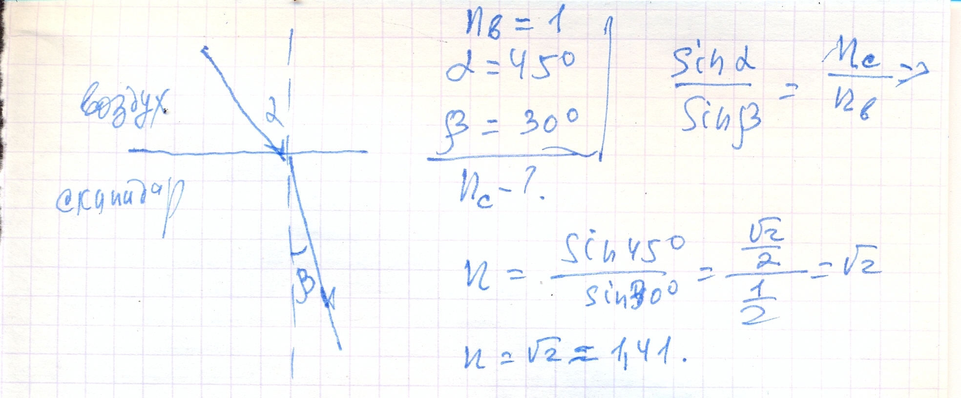 Определите показатель преломления скипидара если известно что при угле падения 45 угол преломления равен 30