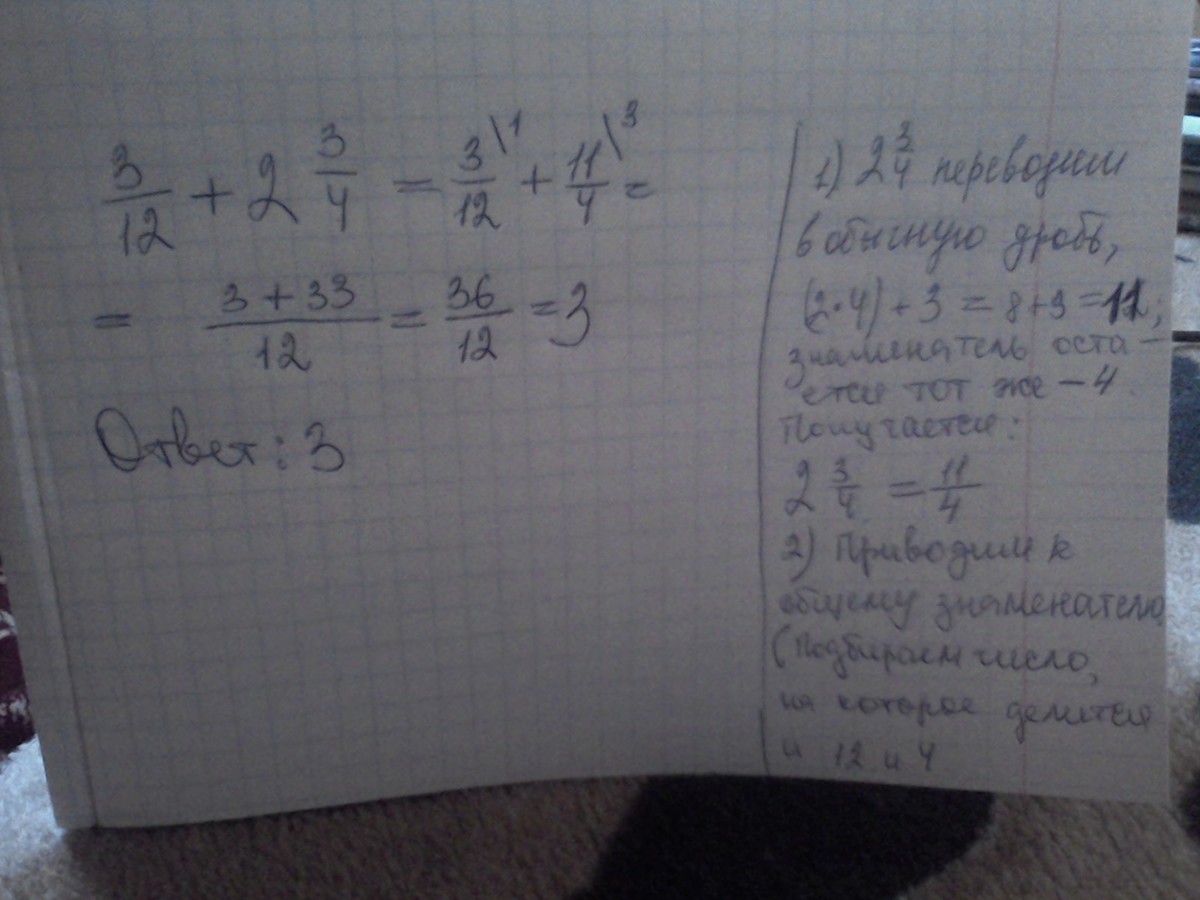 3/12+2целых 3/4= 3/12+11/4=(3+33)/12=36/12=3