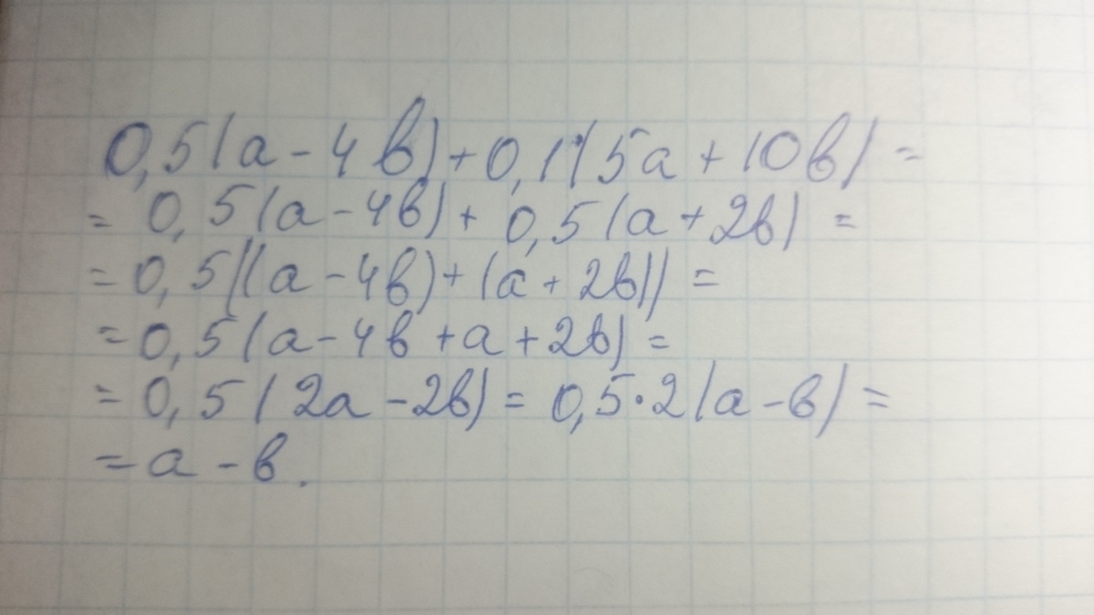 0,5(а-4в)+0,1(5а+10в)=0,5а-2в+0,5а+в=а-в