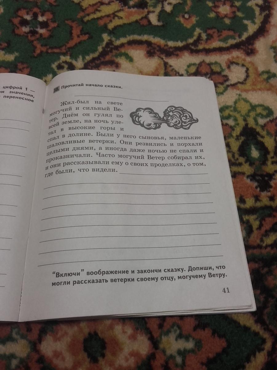 Спросил Ветер у первого сына-ветерка: "Где был, что видел?" А тот ему отвечает: "Над морем синим я летал, волны гонял, рыб на дне морском пугал, позабавился я сполна." Спросил Ветер у второго сына-ветерка: " Где был,что видел?" Тот ему отвечает: "Летал я над бахчей, как дуну, так и покатятся спелые дыни по полю, позабавился я сполна." Спросил Ветер у третьего сына-ветерка: "Где был, что видел?" А тот ему отвечает: "А я крылья ветряной мельницы гонял, людям помогал, утомился." А могучий отец Ветер и говорит: "Горжусь я тобой, сын мой, как вырастешь, станешь таким же сильным как я!" И до сих пор крылья мельниц крутит тот же, но уже не ветерок-озорник, а сильный Ветер.