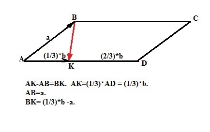 на стороне AD параллелограмма ABCD отмечена точка K так что AK:KD=1:2. выразить вектор BK через векторы а и b где a=AB, b=AD