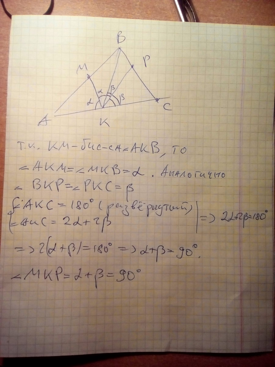 ПОМОГИТЕ ПОЖАЛУЙСТА СРОЧНО! На сторонах AB, ВС, АС треугольника АВС взяты точки М , Р, К соответственно, так что лучи КМ и КР являются биссектрисами угловАКВ и ВКС. докажите, что угол МКР=90°