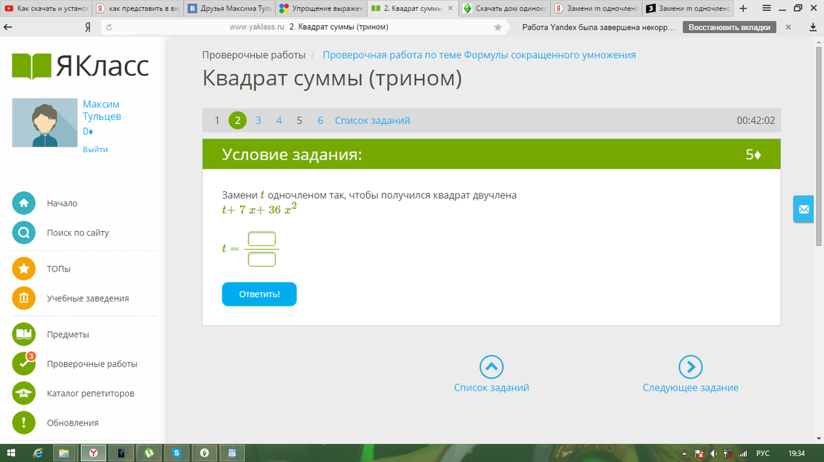 Замени t одночленом так, чтобы получился квадрат двучлена